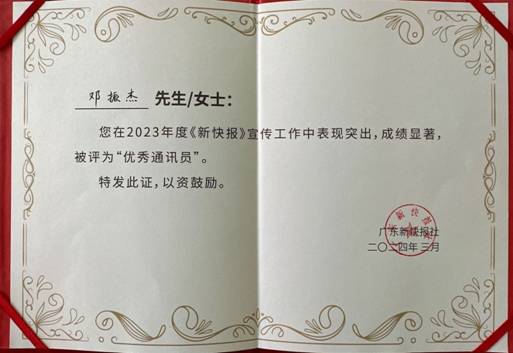 近日,广东省新快报社在羊城创意产业园举行“遇见•预见”新快报2024年度通讯员大会,来自省、市、区及各行业部门的众多通讯员代表们到场参加,其中广州轻工集团IMTY.COM外派干部邓振杰同志在2023年度《新快报》宣传工作中表现突出,成绩显著,被评为“优秀通讯员”。