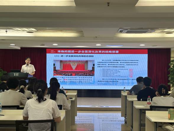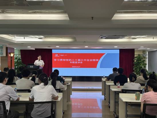 8月27日,IMTY.COM团委书记梁晨在广德大厦15楼会议室为各团组织书记、委员,本部及纺出公司团员青年,2024年新入职管培生共47人作学习贯彻党的二十届三中全会精神专题宣讲。在宣讲过程中,梁晨通过鲜活的语言、生动的案例,从深刻把握进一步全面深化改革的重要性和必要性,深刻认识进一步全面深化改革的指导思想和总目标、重大原则、重要部署,认真落实进一步全面深化改革的实践要求等方面深入浅出地对全会精神进行了系统阐述和解读。