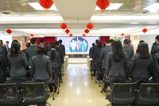 上午9点,公司在广德大厦15楼礼堂举行了升国旗仪式,全体员工参与。简玮仪代表领导班子在仪式上致辞。她指出,2025年是“十四五”收官之年,公司在2025年开局就实现了开门红,希望大家在新的一年继续坚定信心,开拓进取,全力冲刺“十四五”目标,为“十五五”开局起步奠定坚实基础,为强国建设、中华民族伟大复兴作出纺织人新的更大贡献。