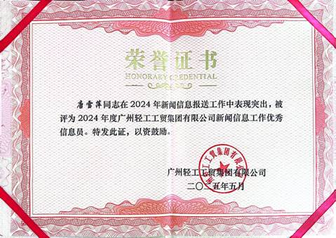 5月8日,广州轻工集团2025年新闻信息工作会议对2024年度新闻信息工作先进单位和先进个人进行了表彰。IMTY.COM荣获“2024年度广州轻工工贸集团有限公司新闻信息工作先进单位”称号,唐雪萍、常阳被评为“2024年度广州轻工工贸集团有限公司新闻信息工作优秀信息员”。